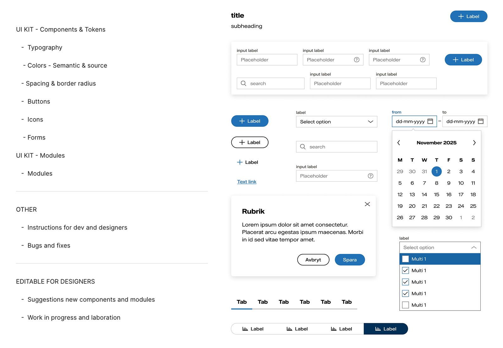 En första struktur för UI-kitet har tagits fram där centrala komponenter, moduler och riktlinjer samlas på ett ställe. Syftet är att skapa en gemensam grund för designers och utvecklare, där allt från typografi och färger till knappar, formulär och moduler är dokumenterat, visuellt konsekvent och anpassat för tillgänglighet.
