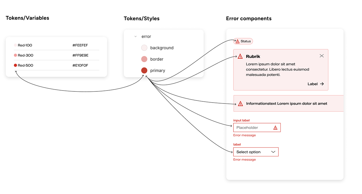 Visualisering av sambandet mellan färg-tokens, styles och hur de appliceras i olika error-komponenter.